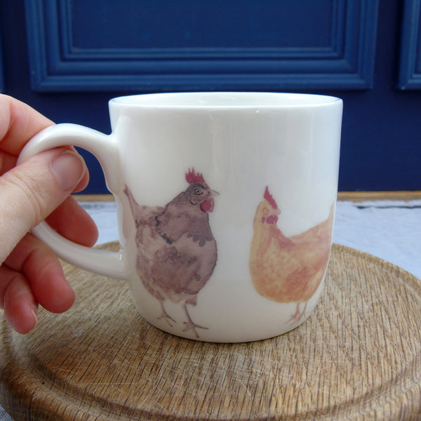 Bone china mug featuring my watercolour paintings of my four pet hens amongst the forget me not flowers they love to eat.