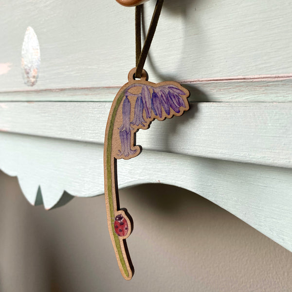 My watercolour painting of an English bluebell and ladybird made into a wooden hanging decoration, a lovely way to bring some of the magic of a spring bluebell wood into your home all year around.